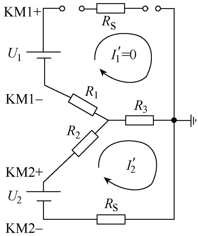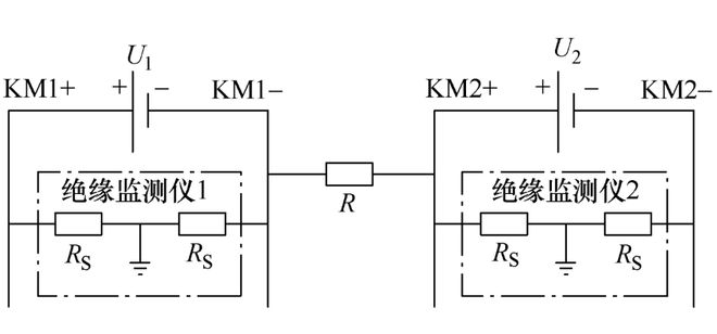 根据本次直流Ⅰ段负极与直流Ⅱ段正极窜电现象与绝缘监测原理,得到直流异极窜电等效电路模型如图5所示,其中R为未知的短接电阻,RS为绝缘监测装置的平衡桥内阻,出厂时确定,约为68 kW。本文所述直流系统标称电压均为110 V。