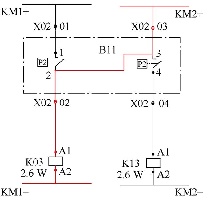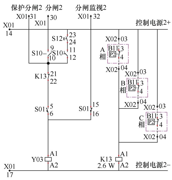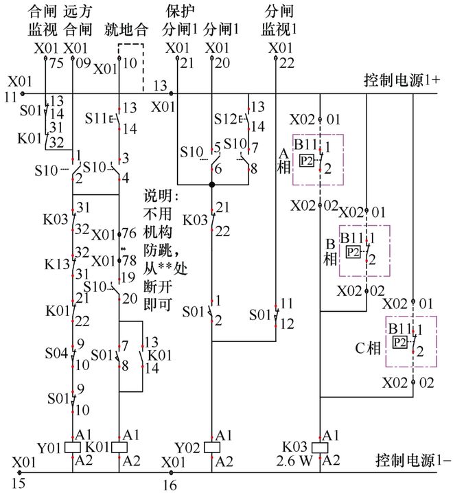 使用螺丝刀解开断路器机构箱中B、C相SF6表计接线),用万用表测量“控制电源1-”X01:15仍有+52 V电压。当解开图1中A相SF6辅助触点B11的X02:02时,“控制电源1-”X01:15的+52 V对地电压消失,因此确认A相SF6表计闭锁触点回路绝缘不良。