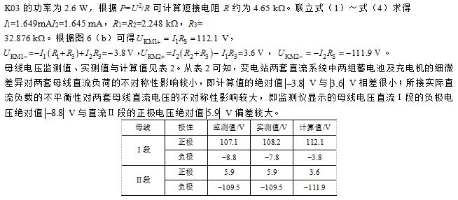控制电源2空气开关闭合,拉开控制电源1空气开关,在机构箱解开A相3副SF6表计辅助触点,使用绝缘兆欧表测量SF6表计触点对地绝缘,绝缘电阻均在10 MW以上。控制电源1空气开关闭合,拉开控制电源2空气开关,在机构箱解开A相3副SF6表计辅助触点,使用绝缘兆欧表测量SF6表计触点对地摇绝缘,绝缘电阻均在10 MW以上。SF6表计辅助触点对地绝缘良好,因此判断并未发生直流接地,直流异常的原因为直流Ⅱ段正极与直流Ⅰ段负极通过一个短接电阻短接,即直流Ⅱ段正极与直流Ⅰ段负极窜电。