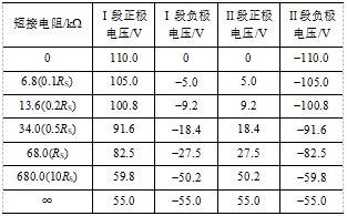 下面分析短接电阻R对控制母线电压的影响。此时,忽略充电机、蓄电池组与负荷不平衡性的影响,假设U1=U2=110 V,取RS=68 kW,将短接电阻R作为变量,根据式(1)~式(4)计算互窜时控制母线电压数值与短接电阻的关系,见表3。由表3可知,直流异极互窜时控制母线电压相对标称电压的偏移量主要取决于短接电阻R与平衡电阻Rs的比值:短接电阻为0,相当于金属性短路,Ⅰ段负极与Ⅱ段正极电压均为0;短接电阻无穷大时,相当于两套系统正常分列运行。